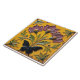 A square tile with a yellow background, featuring a raised floral design with three large flowers with purple petals and yellow centers, green stems, and green leaves. A black butterfly is positioned at the bottom center of the tile. Additional floral elements are placed in the corners.