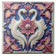 A square tile with a raised design featuring two swans facing each other, their necks curved to form a heart shape, with an orange beak. Between them is a large pink flower with a yellow center. The background is a deep blue color. The tile is decorated with pink and purple floral patterns. The tile has a white border.