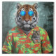 Un tigre con una camisa hawaiana y gafas azules de sol tiene una mesa gris en el bolsillo delantero,