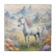 Baldosa cerámica que muestra una imagen de ensueño de un unicornio blanco con una forma de arco iris en un campo de flores. En el fondo se encuentran las majestuosas montañas. El regalo perfecto para dar a los amantes de los unicornios mágicos y místicos. Contiene contenido generativo.