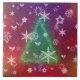 Una dispersión de copos blancos de nieve, hojas y bayas huecas, estrellas y pinos sobre un fondo brillante de rojo, naranja, oro y morado, con una suave forma verde de árbol de Navidad en el medio.