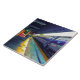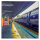 El Tren de la tarde, el título de la obra de arte en esta tela cerámica, es una fotografía original de ZoeSPEAK, realizada en colores pastel primarios. El tren azul brillante y plateado se detiene en la estación, donde la luz solar amarilla llega a la plataforma, y ilumina la pared rosa del edificio.