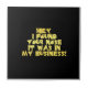 El texto amarillo brillante sugiere humorísticamente que alguien estaba siendo ruidoso, puesto contra un fondo negro. La tipografía atrevida y juguetona mejora el tono cómico del mensaje.