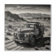 Un camión en un desierto con dibujos de carbón vegetal en las montañas.