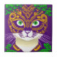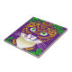 Baldosa cerámica en la imagen de un lindo gato adornado con una máscara en los colores festivos del Mardi Gras. La mezcla de morado, verde y amarillo dorado refleja los tonos tradicionales de la celebración