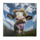 Imagen de una vaca parada en un soleado prado adornada con una vibrante corona floral de margaritas y flores silvestres. La vaca está sacando la lengua, añadiendo un toque de humor y encanto a la escena. El cielo azul intenso y las nubes suaves en el fondo refuerzan aún más el ambiente alegre y caprichoso de la imagen.