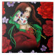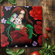Una mujer con el pelo quemado sujetando una máscara de la mascarada veneciana con el rojo y el verde como telón de fondo negro