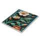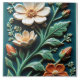 Baldosas de cerámica de época que representan una escena de flores silvestres con flores blancas y naranjas dispuestas en una composición vertical asimétrica, sobre un fondo verde marino, creando un diseño floral vibrante y decorativo.