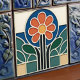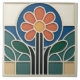 Add a touch of timeless artistic flair to your home with this stunning ceramic tile, inspired by the elegant Art Nouveau movement. The design showcases a beautifully stylized daisy, bursting with color. Its vibrant orange-red petals radiate from a cheerful sunny yellow center, creating a warm and inviting focal point. The flower is artfully framed by a bold royal blue arch and flanked by lush, deep green leaves. The composition rests on a geometric base of muted beige and teal, grounding the organic forms above. Each colored section is outlined with clean, creamy-white raised lines, giving the tile a delightful tactile quality and a look reminiscent of classic stained glass. This versatile tile is perfect for creating a memorable accent in a kitchen backsplash, bathroom, or as a unique decorative piece.