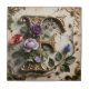 This design is special for its historic, textured appearance that suggests an artifact. The letter 'F' is defined by opulent gold scrollwork and a strikingly detailed cracked blue/verdigris patina. The bouquet of deep purple roses, red poppies, and thistle, adorned with dewdrops, creates an intricate and romantic piece of personalized botanical art.