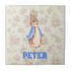 Baldosas de cerámica infantil con un ilustracion de libro de Peter Rabbit de Beatrix Potter sobre un fondo de rosa floral.