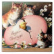 Vintage Easter Greetings: Chick hatching from egg with a trio of adorable kittens looking on.