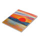Baldosas cerámicas en un océano semiabstracto atardecer detrás de una cordillera, en colores psicodélicos de intenso rojo y naranja, con montañas azul índigo oscuro