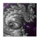 Los patrones fractales complejos surgen de una esfera en blanco y negro que gira en torno a un rico fondo morado. El diseño invoca una sensación de complejidad infinita y profundidad hipnotizante que recuerda a los fenómenos cósmicos.