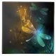 Vuelo de libélula resplandeciente, verde, dibujada de forma artística, con alas transparentes, verdes y amarillas sobre un brillante fondo nocturno con plantas de pantano y luciérnagas. Flauta de dragón resplandeciente.