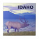 Una alce, conocida como wapiti para los nativos estadounidenses, a orillas del lago Pend Oreille en la manga de Idaho. También está presente el texto que dice "IDAHO".