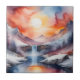 Watercolor of snow covered mountains under red sunset with a small water stream and waterfall