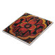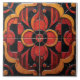 A square tile with a symmetrical pattern, featuring a dark background contrasted by orange, red, and gold designs, the central motif is a diamond shape with an inner floral design, flanked by vertical stripes, the corners are adorned with stylized floral elements and curved shapes, the color palette is warm, with the orange and red standing out against the dark backdrop.