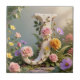 This design is special because it features a glossy, cracked white letter J adorned with dew drops and immersed in a lush, sunlit garden setting. It is richly decorated with a vibrant array of soft pink roses, orange flowers, and bright yellow blooms intertwined with green ferns and climbing vines. The composition is whimsical and rustic, making it perfect for a nursery, wedding, or nature-themed decor.
