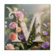 This design is special because it features a distressed, glossy white letter M adorned with dew drops and immersed in a lush, sunlit garden setting. It is richly decorated with a vibrant array of soft pink roses, purple flowers, and bright yellow blooms intertwined with green ferns and climbing vines. The composition is whimsical and rustic, making it perfect for a nursery, wedding, or nature-themed decor.
