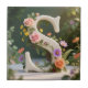 This design is special because it features a smooth, glossy white letter S adorned with dew drops and immersed in a lush, sunlit garden setting. It is richly decorated with a vibrant array of soft pink and peach roses, purple flowers, and bright yellow blooms intertwined with green ferns and climbing vines. The composition is whimsical and rustic, making it perfect for a nursery, wedding, or nature-themed decor.
