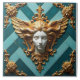 A square relief sculpture featuring a female face with closed eyes, adorned with golden hair and wings, set against a teal and dark green chevron-patterned background. The face is centrally positioned, with golden, stylized wings extending from the sides of the head, blending into ornate golden floral designs at the corners.