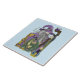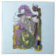 Un mago todo en púrpura sosteniendo un equipo que tiene una bola de cristal morado. Un pequeño dragón verde, nudo celta trabajando, vela y un borde de otoño deja todo en un fondo azul claro
