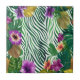 Das Bild zeigt ein lebendiges Mosaik aus üppigen Monstera-Blättern in sattem Grün und Gelb, kombiniert mit prächtigen purpur- und orangefarbenen Blumen, die sich vor einem dynamischen, wellenartigen Hintergrund abheben. Es strahlt eine wilde, tropische Energie und eine fröhliche Fülle aus, die Neugier und Naturverbundenheit weckt.