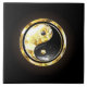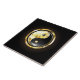 Joyería, oro y símbolo yin yang negro sobre fondo negro. Oro yin yang.