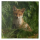 Diseñado con una fotografía que muestra un lindo zorro bebé de piel roja y blanca. Rodeado de hojas y hierbas verdes.