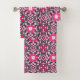 Toalla ambientada en una teja marroquí de estilo Art Déco basada en flores y hojas estilizadas - rosa fucsia, gris plateado / gris y rosa suave, acentuado con blanco