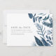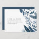 Nuestro Wild Azure guarda la tarjeta de fecha con detalles de su boda clave (nombres, fecha de boda, ubicación y sitio web) acentuados por el follaje acuático de invierno en tonos helados de azul. Un diseño moderno y elegante salva el diseño de fecha que es una minimalista moda de la tendencia botánica.