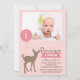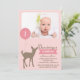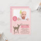 Invitación a la fiesta de cumpleaños de personalizable perfecta para los niños. Tiene un patrón rayado rosa y blanco y un ciervo lindo con un globo fiesta.