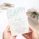 ¡Brrr! Las invitaciones chic heladas para baby showers de invierno presentan un borde superior de copos de nieve en un pálido aqua invernal borrascoso, con "baby hace frío afuera" en letras turquesas y grises. Personalice con los detalles de su baby shower neutrales en cuanto al género debajo usando los campos de la plantilla. Las tarjetas se revierten a un aqua claro sólido.