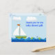 Un barco de vela luminoso y alegre con tarjeta postal para bebés, nota de agradecimiento que se coordina con las invitaciones a la ducha de bebé "Náutica marinera". Los gráficos están en ambos lados para un toque decorativo adicional. Arte vectorial original de Night Owl's Menagerie, 2013.