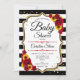 Invitación de Baby Shower. Diseño elegante con rayas negras y blancas y oro purpurina falso. Cuenta con girasoles, fuentes de escritura de moda de rosas rojas y confetti. Perfecto para un Baby Shower elegante. Personaliza con tus propios detalles.