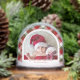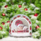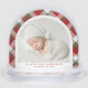 Elegante globo de nieve para conmemorar la primera Navidad de tu bebé recién nacido con "Mi Primera Navidad" y sus fotos en marcos de arco sobre un alegre fondo rojo, verde y blanco de yeso estacional. Personalice con su nombre y fecha de nacimiento en letras rojas simples.