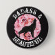 ¡Demande su ferocidad y la fuerza proclamándole es un BADASS HERMOSO! Sienta hermoso y potente llevando este diseño hermoso y feroz de un lobo negro que lleva una corona rosada de la flor que grita en la victoria antes de un círculo de los rosas rosados oscuros rodeados con las palabras: Badass y hermoso. Declárese los badass hermosos, incluso si está solamente llevando un botón alrededor de la casa.