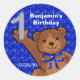 Un pequeño oso de peluche marrón lindo con un arco azul bailando con luces azules son pegatinas redondos de primer cumpleaños divertidos que pueden ser usados como pegatinas de scrapbook con papeles de scrapbook a juego disponibles en mi tienda. Personalice el nombre y la fecha utilizando la plantilla proporcionada.