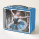 Bailarina de ballet vestida de azul y oro en medio de la danza.