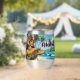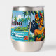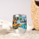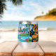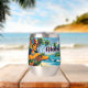 Bonito estilo libro de historietas estilo ai art. La bailarina de hula en la playa rodeada de bonito Hibiscus, flores tropicales y palmeras con fondo oceánico.