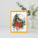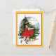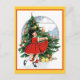 Diseño adorable de la tarjeta de Navidad del vintage con una niña en el baile rojo alrededor del árbol de navidad adornado. El árbol está delante de una ventana redonda.