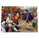Pieter Bruegel the Elder (1525-1530 - 9 de septiembre de 1569) fue el artista más importante de la pintura del Renacimiento Holandés y Flamenco, pintor e imprimidor de Brabant, conocido por sus paisajes y escenas campesinas (llamada pintura de género); fue pionero en hacer de ambos tipos de temas el foco en los grandes cuadros. Los historiadores del arte adivinan que nació en Breda o en Breugel (un pueblo en el municipio de Son en Breugel), ambos ubicados en la actual provincia holandesa de Brabante del Norte. Fue una influencia formativa en la pintura holandesa de la Edad de Oro y más tarde pintó en general en sus innovadoras elecciones de materia, como una de las primeras generaciones de artistas en crecer cuando los temas religiosos habían dejado de ser el tema natural de la pintura. Tampoco pintó retratos, el otro pilar del arte neerlandés. Después de su entrenamiento y de viajar a Italia, regresó en 1555 para instalarse en Amberes, donde trabajó principalmente como un prolífico diseñador de impresiones para el principal editor del día. Sólo hacia fines de la década cambió para hacer de la pintura su medio principal, y todas sus famosas pinturas provienen del siguiente periodo de poco más de una década antes de su muerte temprana, cuando probablemente tenía unos cuarenta y tantos años, y en la cima de sus poderes. Además de mirar hacia adelante, su arte revigoriza temas medievales como las babosas marginales de la vida ordinaria en manuscritos iluminados, y las escenas del calendario de los trabajos agrícolas envueltas en paisajes, y los pone a una escala mucho mayor que antes, y en el costoso medio de la pintura al óleo. Hace lo mismo con el mundo fantástico y anárquico desarrollado en las impresiones y ilustraciones de libros renacentistas. Cita:Wikipedia