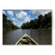 Un bote lanza una nariz por un río en la selva amazónica bajo nubes esponjosas en un cielo azul.