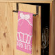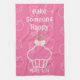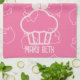 "Haz feliz a alguien". Toalla de cocina rosa con pasteles y cerezas. Un regalo alegre para el panadero en la familia o, tenlo por usted mismo. Además, una divertida idea de la casa para calentar el calor con algunas golosinas recién horneadas.