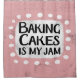 "Baking Cakes Is My Jam" es un lindo diseño de texto en rosa con texto negro, junto con una forma de acento blanco y puntos caprichosos de textura blanca que lo rodean.