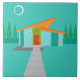 Esta baldosa cerámica de la casa del dibujo animado de la era espacial es el sueño de un amante retro viene verdad. Las características del diseño minimalistas del arte aguamarina empiedran la casa con grande, ventanas del azul de pavo real. Colgando del atómico, inclinándose, el tejado anaranjado, una lámpara de Sputnik del amarillo ilumina la puerta principal. La puerta principal roja ahuecada con el tirador del starburst es compensada maravillosamente por los tablones de madera verdes verticales de la entrada exterior. Una trayectoria de piedra gris corta a través del césped prístino, que aparece turquesa en el claro de luna. Detrás de la casa, una fila de un alto, fina, árboles señala al cielo de la turquesa y a la silueta blanca de una Luna Llena. Mientras que no hay gente visible, en una noche como esto, los habitantes de la casa kitschy son probablemente cantidad de noticias de observación interior de los astronautas.