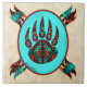 ¡Brilla tu casa con este exclusivo mosaico de cerámica de "One of a Kind" (una especie) de pata de oso tribal! Cuenta con un recorrido de oso tribal nativo americano sobre un fondo turquesa... ¡Rodeado por un borde suroeste en llamas turquesa, Naranja y negra! Este es un original diseño de arte "One of a Kind" del artista Kerry Miller.