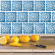 Baldosas de cerámica geométrica azul para chimenea, cocina o baño. Dimensiones: 6" x 6"; espesor: 0,19" Peso: 8,5 oz. Fabricado con cerámica blanca Impresión a todo color