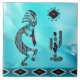 Brilla tu casa con este exclusivo mosaico de cerámica Kokopelli del suroeste de Kokopelli. El Kokopelli, de color turquesa, baila flauta en torno a un cactus bajo el sol sobre un fondo de color moreno...con un borde inferior en turquesa, dorado, rojizo y blanco! Este es un diseño de arte original del artista Kerry Miller.